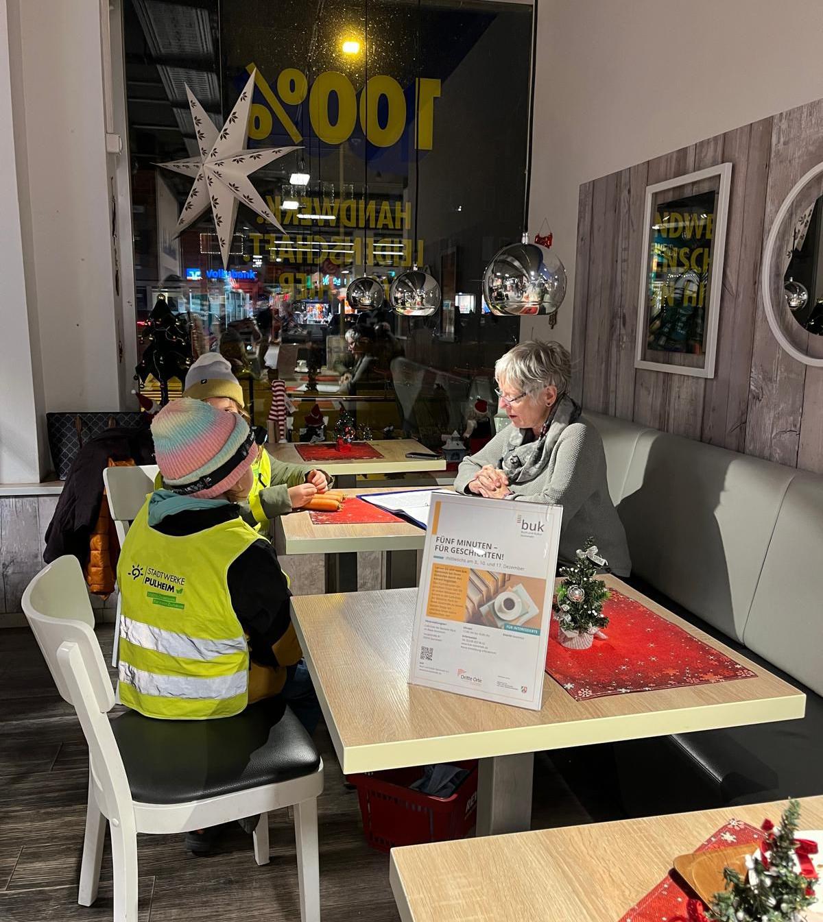 Am Mittwochabend, dem 3.12. hielten viele Kunden des Rewe-Marktes kurz inne, als Sie dieses Angebot in der Kaffee-Ecke der Bäckerei Flock entdeckten. Viele waren überrascht und eilten bei ihren adventlichen Einkäufen weiter. Aber einige setzten sich dann doch neugierig zu Beate Kirchhoff und Renate Rochaz aus dem buk-Team, die einige kurze interessante Texte ausgesucht hatten.