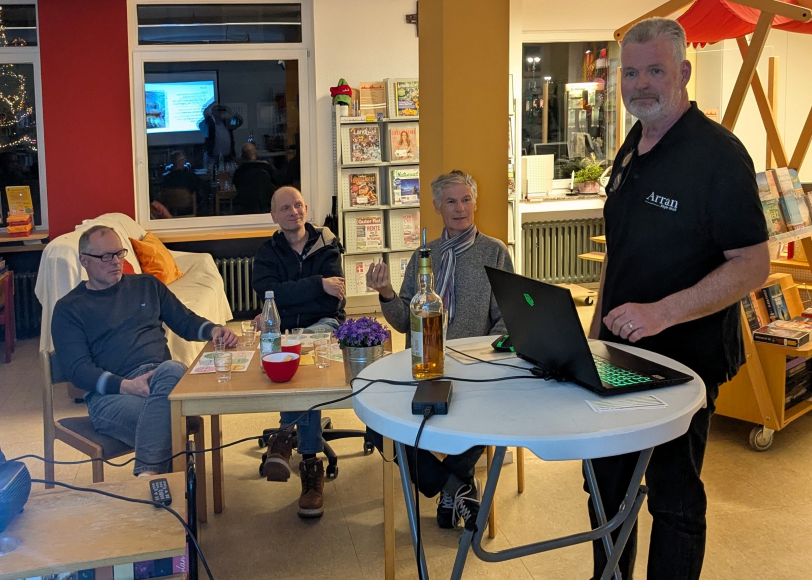 An drei Mittwochabenden in der Adventszeit hielten viele Kunden des Rewe-Marktes kurz inne, als Sie dieses Angebot in der Kaffee-Ecke der Bäckerei Flock entdeckten. Viele waren überrascht und eilten bei ihren adventlichen Einkäufen weiter. Aber einige setzten sich dann doch neugierig zu den Mitarbeiter/-innen des buk-Teams, die einige kurze interessante Texte ausgesucht hatten.