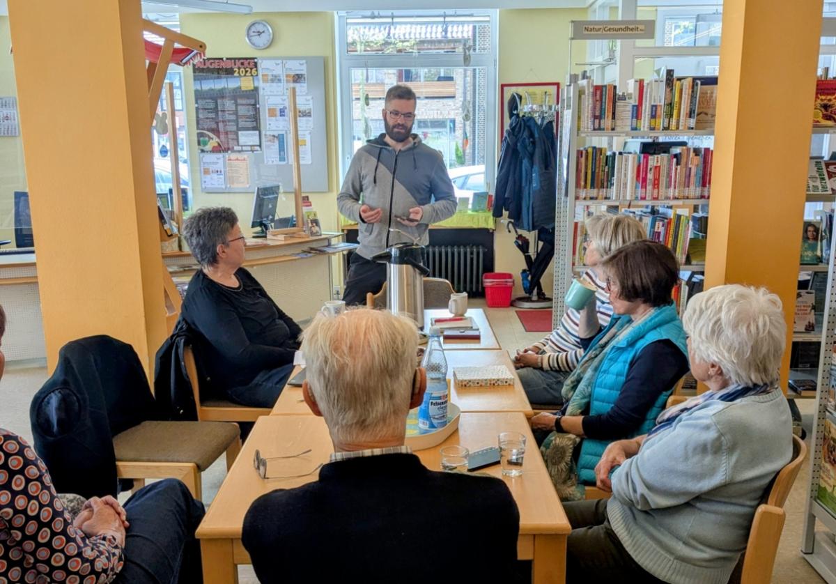 Am Montag dem 21. April fand in der Bücherei Stommeln zum ersten Mal unser digitales Seniorencafé statt. Zehn Teilnehmende waren im Laufe des Nachmittags da und trauten sich, ihre Fragen rund um Smartphones, Apps, Internet und die beste Sicherheit beim Gebrauch zu stellen. Referent Sebastian Schulz aus Wuppertal nahm sich viel Zeit und ging individuell und geduldig auf alle Anliegen ein – von Spam-Nachrichten bis hin zu praktischen Alltagsfragen.